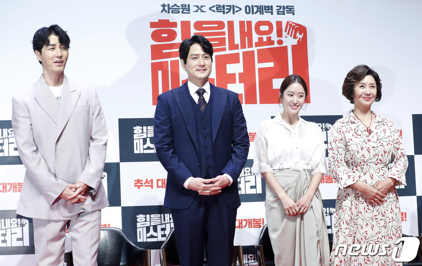 (서울=뉴스1) 권현진 기자 = 배우 차승원(왼쪽부터), 박해준, 전혜빈, 김혜옥이 7일 오후 서울 강남구 압구정 CGV에서 열린 영화 '힘을 내요, 미스터 리' 제작 보고회에 참석해 인사를 하고 있다.