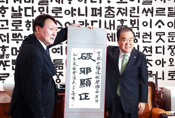윤석열 신임 검찰총장(왼쪽)이 7일 오전 서울 여의도 국회에서 문희상 국회의장이 선물한 족자를 들고 문 의장과 기념촬영을 하고 있다. 김경록 기자 |