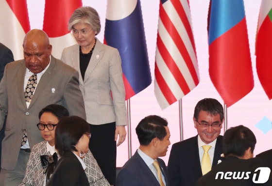 (방콕(태국)=뉴스1) 이광호 기자 = 강경화 외교부장관과 고노다로 일본 외무상 등이 2일 오후(현지시간) 태국 방콕 센타라 그랜드호텔에서 열린 아세안지역안보포럼(ARF) 외교장관회의에서 기념촬영을 마친뒤 자리로 향하고 있다.2019.8.2/뉴스1 <저작권자 © 뉴스1코리아, 무단전재 및 재배포 금지> |