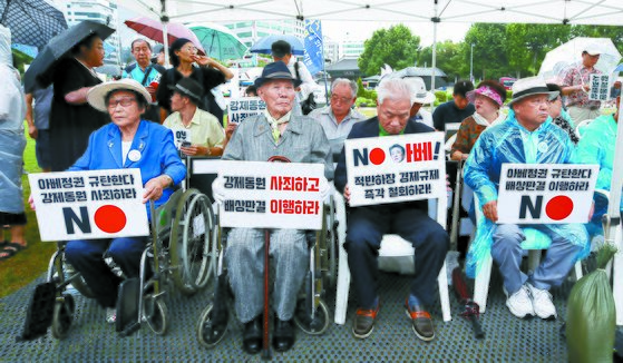한·일 갈등의 향배가 광복절을 기점으로 기로에 섰다. 쟁점 당사자인 강제징용 피해자와 유가족은 15일 서울광장에서 일본 정부의 사죄와 일본 기업의 배상판결 이행을 촉구했다. [뉴스1] |