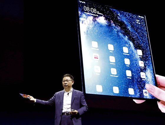리차드 유 화웨이 컨슈머 비즈니스 최고경영책임자가지난 2월 24일(현지시간) 스페인 바르셀로나 MWC 19 행사장에서 첫 폴더블폰인 '메이트X'를 펼쳐 보이고 있다. [AP=연합뉴스] |
