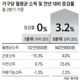 22일 통계청이 발표한 '2분기 가계동향 조사(소득 부문)'를 보면 소득 하위 20%인 1분위 가구의 월평균 소득은 132만5500원으로 작년보다 불과 562원 늘었다. 작년 1분기부터 올해 1분기까지 이어진 소득 감소세가 멈췄지만, 이는 일해서 돈을 더 번 게 아니라 공적연금·기초연금과 같은 '이전(移轉)소득'이 늘어난 덕분이었다. 1분위 가구의 지난 2분기 월평균 이전소득은 전년 대비 9.7%나 늘어난 65만2100원으로 전체 소득의 절반가량을 차지했다.