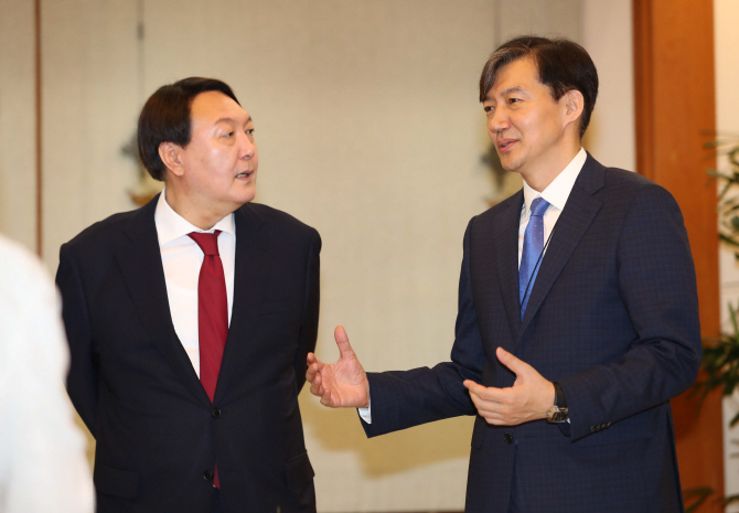 윤석열 신임 검찰총장이 지난달 25일 청와대 본관에서 검찰총장 임명장 수여식 시작을 기다리며 조국 당시 민정수석과 대화하고 있다 (사진=뉴시스) |