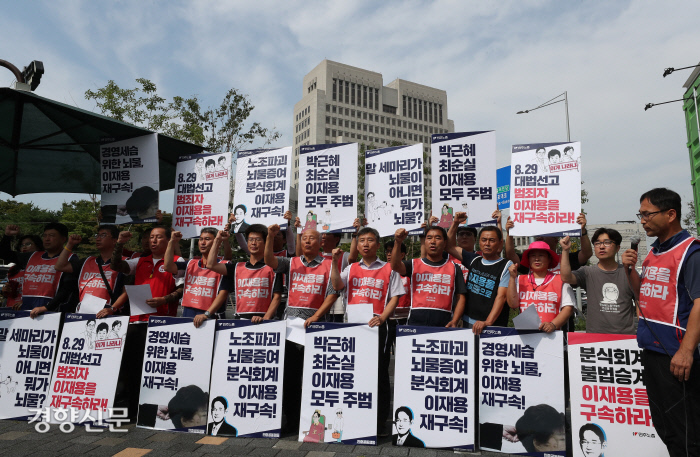 박근혜 전 대통령(67)과 비선실세 최순실씨(63), 이재용 삼성전자 부회장(51)에 대한 상고심 판결이 내려진 29일, 서울 서초구 대법원 인근에 친박단체가 집결했다. 민주노총과 민중공동행동도 대법원 주위에 모였다. 이들은 대법원 선고 직후 희비가 엇갈렸다.