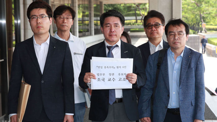 ▲ 조국 법무부 장관 후보자를 모욕죄로 고소하기 위해 서울중앙지검에 들어서는 '반일종족주의' 공동저자인 주익종 낙성대경제연구소 연구위원(가운데)