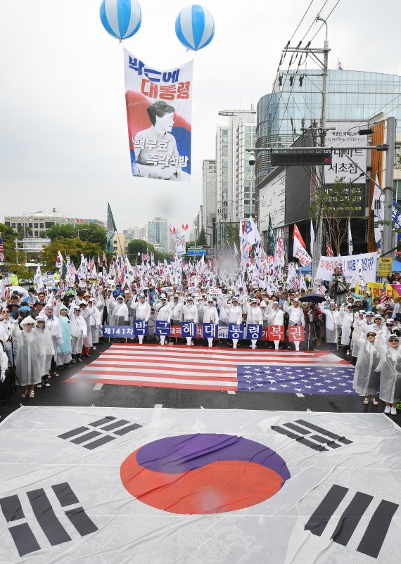 박근혜 전 대통령과 최순실, 이재용 삼성전자 부회장 등의 국정농단 상고심 선고가 내려진 29일 서울 서초구 대법원 앞에서 대한애국당과 보수단체 회원들이 박 전 대통령의 무죄 판결을 촉구하고 있다.사진=김범석 기자 |