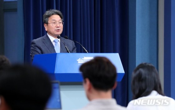 【서울=뉴시스】전신 기자 = 강기정 정무수석이 30일 청와대 춘추관 대브리핑룸에서 조국 법무부 장관 후보자 인사청문회 관련 브리핑을 하고 있다. 2019.08.30. photo1006@newsis.com |