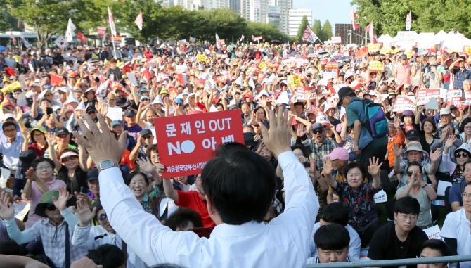 30일 부산 부산진구 송상현광장에서 자유한국당이 마련한 문재인 정권 규탄 집회에서 황교안 대표가 참석자들을 향해 손을 들어 인사하고 있다. (사진=연합뉴스) |
