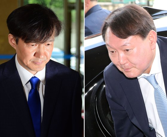 조국(왼쪽) 법무부 장관 후보자가 9일 오후 서울 종로구 적선동 현대빌딩에 마련한 사무실로 출근해 기자들에게 소감 발표 후 이동하고 있는 모습과 같은 날 윤석열 검찰총장이 유남석 헌법재판소장을 예방하기 위해 서울 종로구 헌법재판소로 입장하고 있는 모습. [뉴시스] |