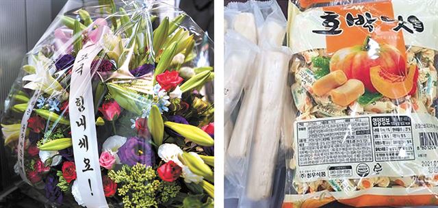 압수수색에 이은 관련자 소환 등 조국 법무부 장관 후보자에 대한 검찰 수사가 본격화되면서 조 후보자를 지지하는 이들이 반발하고 있다. 지난 3일 서울 서초동 대검찰청 윤석열 검찰총장 집무실에 호박엿(오른쪽 사진)이, 반대로 조 후보자 인사청문회 준비사무실에는 지난달 28일 꽃바구니가 배달됐다. 연합뉴스ㆍ이한호 기자 |