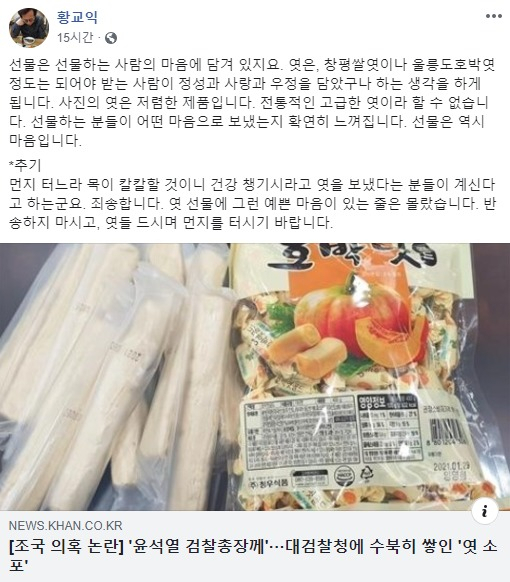 이어 황 씨는 “먼지 터느라 목이 칼칼할 것이니 건강 챙기시라고 엿을 보냈다는 분들이 계신다고 한다. 죄송하다. 엿 선물에 그런 예쁜 마음이 있는 줄은 몰랐다”며 “반송하지 마시고, 엿들 드시며 먼지를 터시기 바란다”고 전하며 글을 끝맺었다.