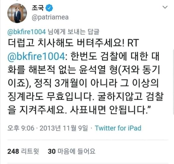 2013년 11월, 조국 당시 서울대 법학전문대학원 교수는 트위터상에서 민주당 박범계 의원의 글을 공유(리트윗)하며 “더럽고 치사해도 버텨주세요”라고 덧붙였다. 박범계 의원은 해당 게시물에서 윤석열 검찰총장(당시 여주지청장)을 향해 “정직 3개월이 아니라 그 이상의 징계라도 무효”라며 “굴하지 않고 검찰을 지켜주세요. 사표 내면 안 됩니다”고 썼다.