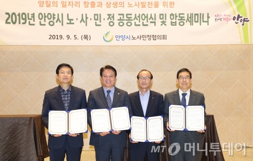한편, 노사민정협의회 정례회의에 이은 노사민정 공동선언식에는 최대호 안양시장 한국노총 경기중부지역지부 의장, 안양과천상공회의소 회장, 고용노동 안양지청장 등 노사민정 대표가 공동선언문에 서명하고 노사화합을 통한 좋은 일자리 만들기에 힘을 모을 것을 다짐했다.