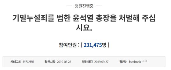 윤석열 검찰총장 처벌을 촉구하는 청와대 국민청원이 20만 서명을 넘겼다. 조국 법무부 장관 후보자 인사청문회가 진행 중인 상황에서 검찰이 조 후보자의 배우자를 전격 기소한 데 따른 영향으로 보인다.