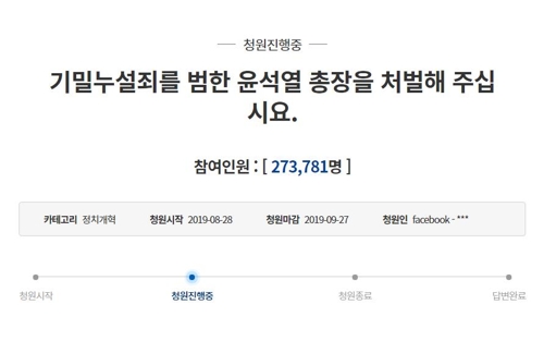 '기밀누설죄를 범한 윤석열 총장을 처벌해 주십시오'라는 제목으로 지난달 28일에 올라온 이 청원에는 7일 오후 3시 30분 현재 27만3천여명이 참여했다.