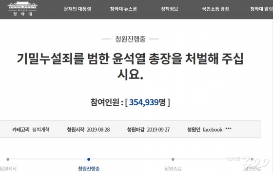 윤석열 검찰총장이 조국 법무부 장관 후보자 수사 관련 기밀을 누설했다며 처벌해달라는 청와대 국민청원이 8일 오전 10시17분 현재 35만명을 넘어섰다.