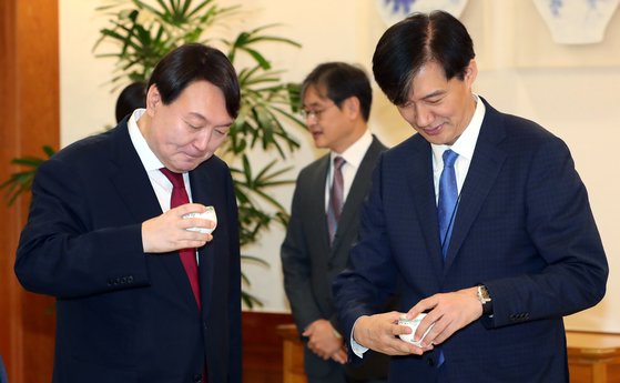 조국(54) 법무부 장관과 윤석열(59·사법연수원 23기) 검찰총장이 전면으로 맞붙은 모양새다. 김오수(56·20기) 법무부 차관 등이 9일 대검 고위 간부에게 조 장관 관련 수사를 검찰총장 지휘를 받지 않는 독립수사팀을 구성해 맡기는 게 어떻겠냐는 제안을 했다. 하지만 윤 총장은 이런 법무부의 제안이 “수사의 중립성을 흔들 수 있다”고 판단해 거절했다고 한다.