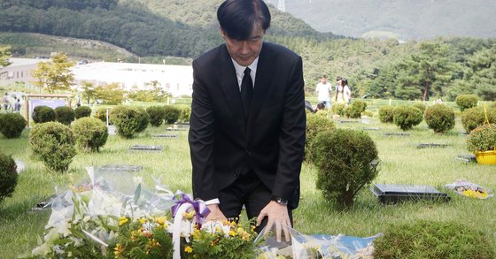조국 법무부 장관이 14일 오전 부산 기장군 부산추모공원에 안장된 고 김홍영 전 검사 묘소에서 참배하고 있다. [연합뉴스] |