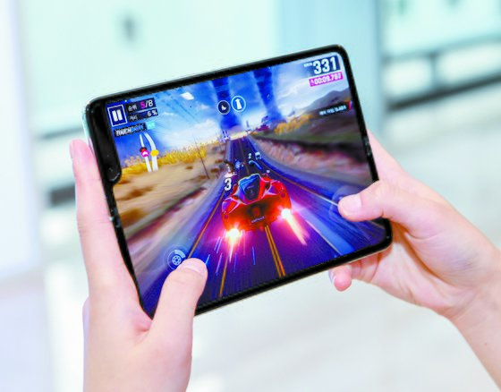 갤럭시 폴드로 레이싱 게임 ‘아스팔트 9’를 플레이하고 있다. [사진 삼성전자] |