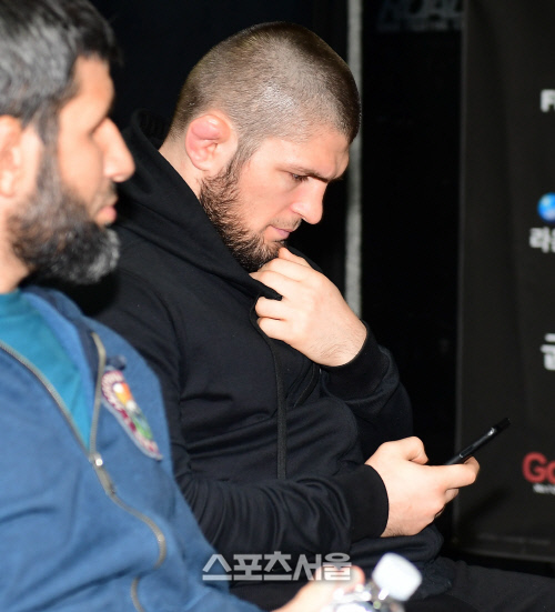 지난 2월에 열린 100만불 토너먼트 결승전 기자회견에서 하빕 누르마고메도프가 권아솔의 도발에 아무런 응답도 않은 채 자신의 핸드폰만 만지작 거리고 있다. 이주상기자 rainbow@sportsseoul.com |