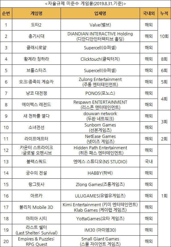 기구 내 자율규제평가위원회(위원장 황성기)는 8월31일 기준 미준수 게임을 20종(온리인4·모바일16)으로 집계하여 공개대상에 포함했다.
