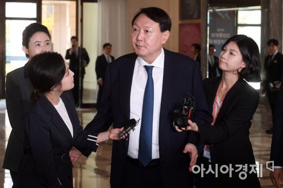 [아시아경제(인천)=송승윤 기자] 윤석열 검찰총장이 25일 취임 이후 처음으로 참석한 국제행사에서 조국 법무부 장관 일가를 둘러싼 검찰 수사에 대해 "절차에 따라 진행되고 있다"고 언급했다. 조 장관 관련 수사가 시작된 이후 공식 석상에서 처음 나온 발언이다.