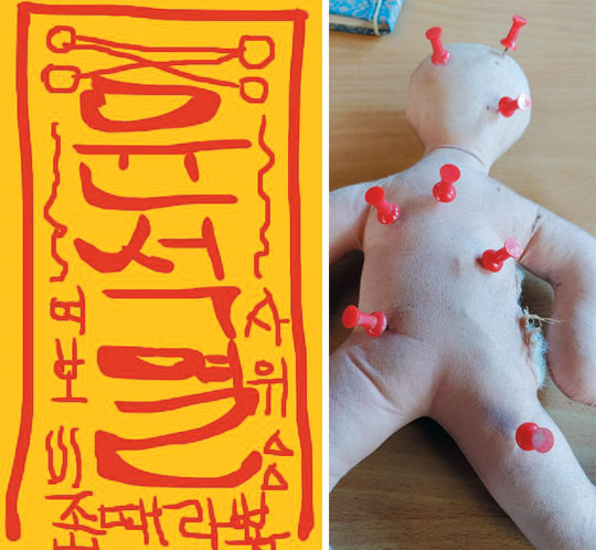 친문 네티즌들이 윤석열 검찰총장을 저주하기 위해 만든 부적(왼쪽)과 솜 인형. /트위터 |
