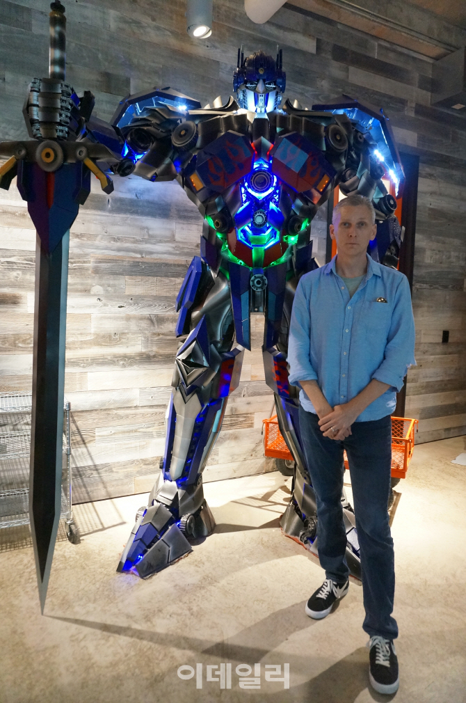 팀 필즈 카밤 스튜디오 창업자 겸 최고경영자(CEO)가 옵티머스 프라임 앞에서 포즈를 취하고 있다. 사진 김혜미 기자 |