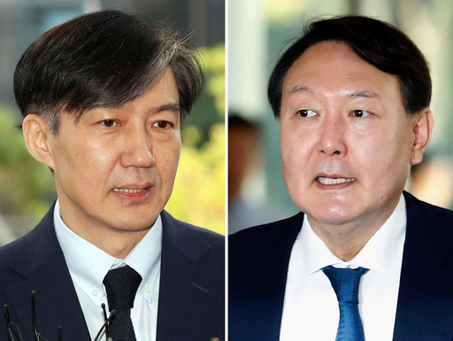 조국 법무부 장관(왼쪽)과 윤석열 검찰총장이 지난 25일 각각 ‘검사와의 대화’ 자리를 위해 충남 대전지방검찰청 천안지청으로, 인천 중구 파라다이스 호텔에서 열린 제29차 마약류 퇴치 국제협력회의 개막식에 참석하며 기자들의 질문에 답하고 있다. |