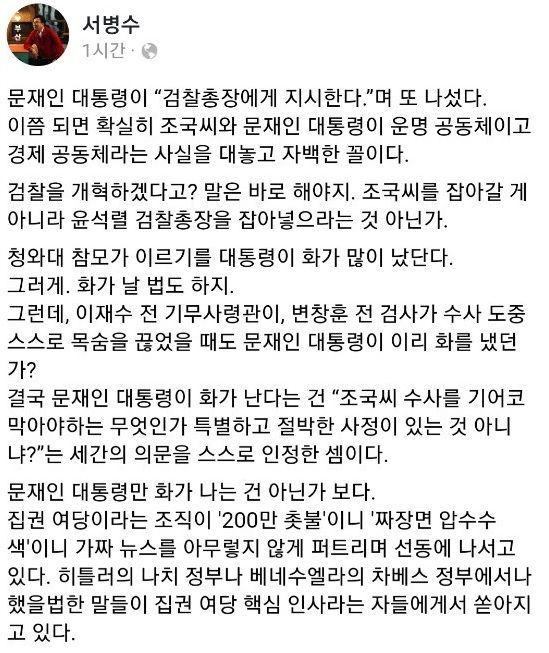 1일 서 전 시장은 자신의 페이스북을 통해 "이쯤 되면 확실히 조국씨와 문재인 대통령이 운명 공동체이고 경제 공동체라는 사실을 대놓고 자백한 꼴이다"고 밝혔다.