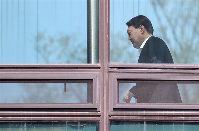 윤석열 검찰총장이 30일 오후 서울 서초구 대검찰청에서 구내식당으로 향하고 있다. 연합뉴스 |