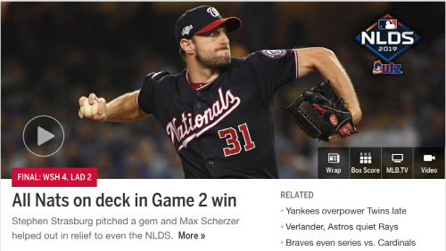 워싱턴의 승리로 시리즈 전적 1승 1패가 된 가운데 오는 7일 디비전시리즈 3차전에서 워싱턴은 셔저, 다저스는 류현진을 선발투수로 예고했다. 2차전 불펜 등판에서 14개의 공을 던진 셔저가 3차전에서 활약을 이어갈지 관심이 모아진다.