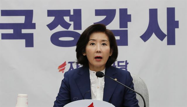 나경원 자유한국당 원내대표가 8일 국회에서 열린 ‘文실정 및 조국 심판’ 국정감사대책회의에서 발언하고 있다. 연합뉴스 |