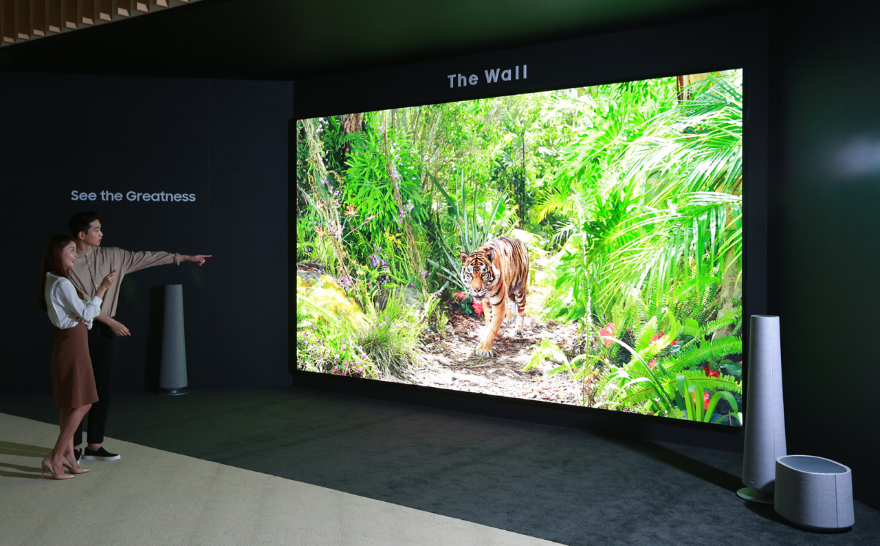 영상디스플레이 코너에는 8K와 퀀텀닷 기술의 결합으로 최고 수준의 화질을 보여 주는 QLED 8K 98형(인치)과 모듈형 디스플레이 더 월 219형이 초대형 화면을 통해 몰입감 넘치는 시청 경험을 제공한다.