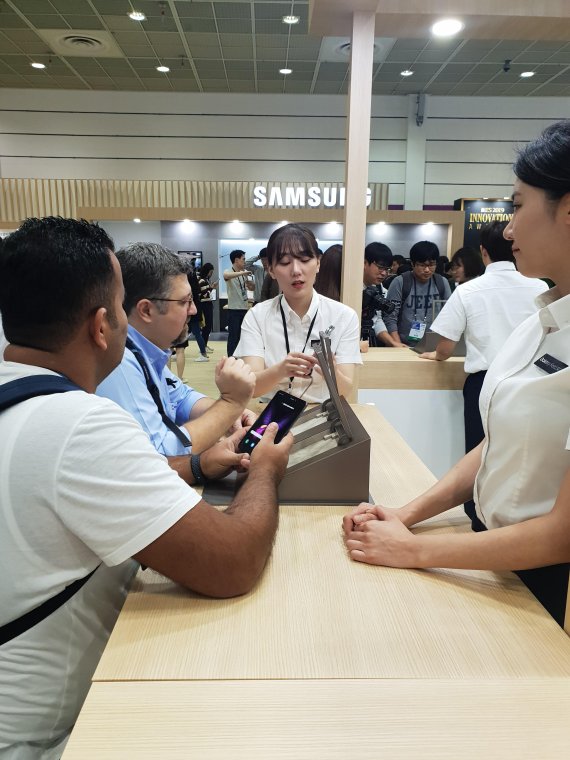 '한국판 CES(국제전자제품박람회)'로 불리는 이날 행사에서 삼성전자는 지난 9월 세계 최초로 출시한 갤럭시 폴드를 선봉에 내세웠다. 삼성은 1023㎡ 규모로 마련한 부스 입구에 갤럭시 폴드를 배치, 10석 가까이 마련된 안내석이 자리가 빌 틈이 없을 정도로 관람객들이 몰렸다. 관람객들은 갤럭시 폴드를 접어보고, 셀프 카메라 촬영을 했다. 접히는 부분에 주름이 생기는 지도 살펴봤다. 관람객 유모씨(29)는 "갤럭시 폴드를 접고 펴다 보니까 주름이 심할 줄 알았는데 실제 보니까 거의 없었다"며 "무겁지도 않아서 휴대성도 생각했던 것 보다 좋았다"고 전했다