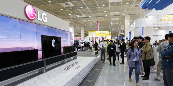 국내 최대 전자·정보기술(IT) 관련 전시회인 한국전자전(KES 2019)이 8일 서울 삼성동 코엑스에서 성황리에 개막했다. 관람객들이 `LG 시그니처 롤러블 올레드 TV`를 신기한 듯 보고 있다. [이충우 기자] |