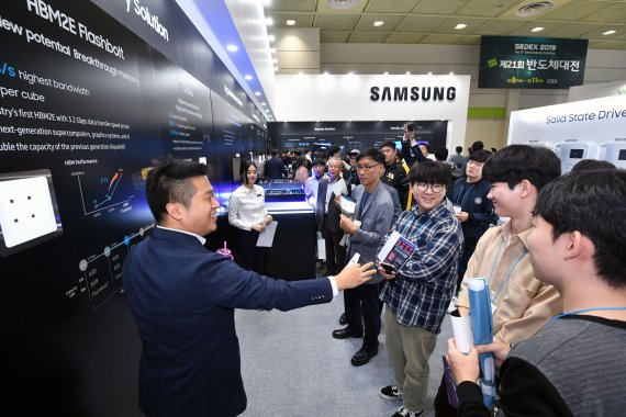 '한국판 CES(국제전자제품박람회)'로 불리는 이날 행사에서 삼성전자는 지난 9월 세계 최초로 출시한 갤럭시 폴드를 선봉에 내세웠다. 삼성은 1023㎡ 규모로 마련한 부스 입구에 갤럭시 폴드를 배치, 10석 가까이 마련된 안내석이 자리가 빌 틈이 없을 정도로 관람객들이 몰렸다. 관람객들은 갤럭시 폴드를 접어보고, 셀프 카메라 촬영을 했다. 접히는 부분에 주름이 생기는 지도 살펴봤다. 관람객 유모씨(29)는 "갤럭시 폴드를 접고 펴다 보니까 주름이 심할 줄 알았는데 실제 보니까 거의 없었다"며 "무겁지도 않아서 휴대성도 생각했던 것 보다 좋았다"고 전했다