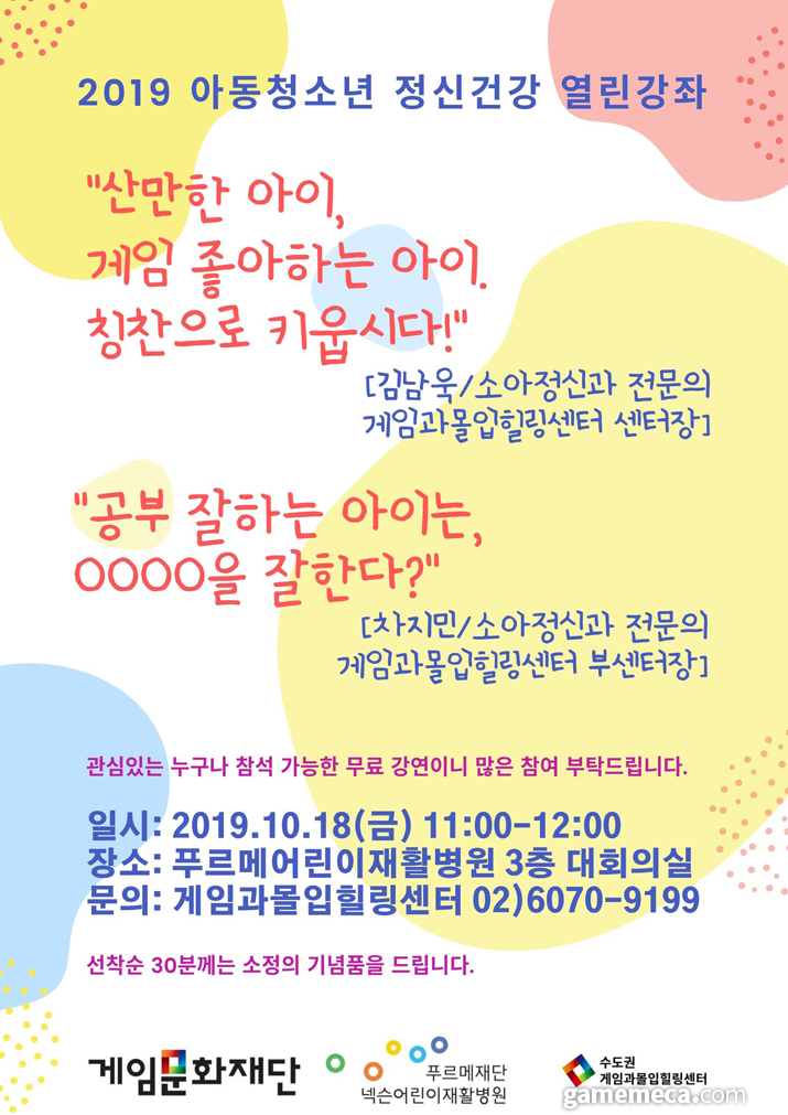 수도권 게임과몰입힐링센터 김남욱 센터장(소아정신과 전문의)과 차지민 부센터장(소아정신과 전문의)이 각각 '산만한 아이, 게임 좋아하는 아이. 칭찬으로 키웁시다'와 '공부 잘하는 아이는, ○○○○을 잘한다?'를 주제로 ADHD와 게임과몰입, 청소년기 정신발달 과정 등에 관한 강연을 펼친다.