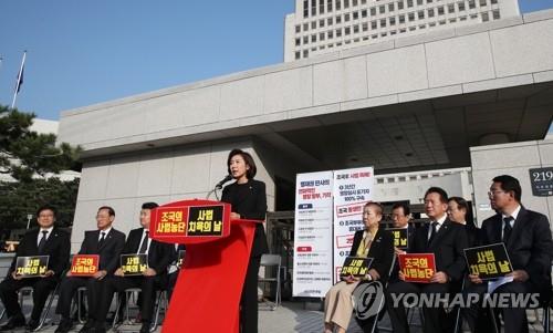 한편 이날 대법원에서 열린 현장 국감대책회의에서 한국당은 법원이 증거인멸 등 발부 사유가 명확한 조 장관 동생의 영장을 기각한 것은 '사법농단'이라고 주장했다.