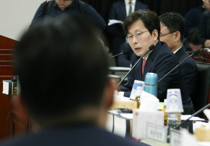 11일 오후 대구고등검찰청에서 열린 국회 법제사법위원회의 2019년 대구·부산 고등검찰청, 대구·부산·울산·창원 지방검찰청에 대한 국정감사에서 여환섭 대구지검장이 대안신당 박지원 의원의 질의에 답하고 있다. (사진=연합뉴스) |