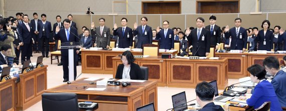 윤석열 검찰총장과 검찰 관계자들이 17일 오전 서울 서초구 대검찰청에서 열린 국회 법제사법위원회의 대검찰청에 대한 국정감사에서 선서를 하고 있다. 사진=박범준 기자