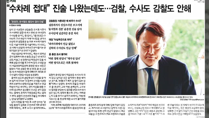 한겨레21은 지난 11일 조사단이 2013년 검찰·경찰 수사 기록에 포함된 김 전 차관의 스폰서 윤중천(58) 씨 전화번호부, 압수된 명함, 다이어리 등을 재검토하면서 '윤석열'이라는 이름을 확인했으나 조사 결과를 넘겨받은 검찰 수사단이 사실확인 없이 사건을 덮었다고 보도했습니다.