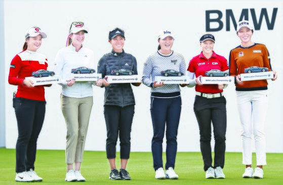 선수들이 대회 스폰서 업체인 BMW 모형차를 들고 있다. 왼쪽부터 최혜진, 폴라 크리머, 대니얼 강, 고진영, 브룩 헨더슨, 허미정. 최혜진과 대니얼 강, 허미정은 부산에 연고가 있다. [연합뉴스] |