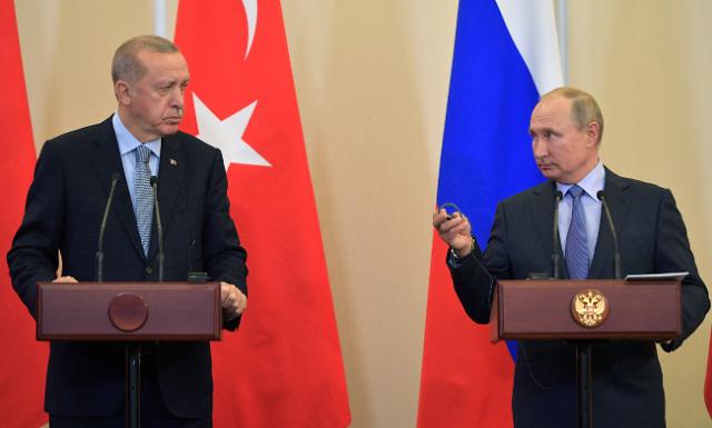 기자회견하는 푸틴·에르도안 (소치 로이터=연합뉴스) 블라디미르 푸틴(오른쪽) 러시아 대통령과 레제프 타이이프 에르도안 터키 대통령이 22일(현지시간) 러시아 남부 휴양도시 소치에서 정상회담을 마친 후 기자회견하고 있다. bulls@yna.co.kr/2019-10-23 07:08:36/ <저작권자 ⓒ 1980-2019 ㈜연합뉴스. 무단 전재 재배포 금지.> |