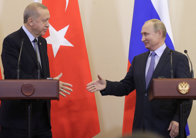 블라디미르 푸틴 러시아 대통령과 레제프 타이이프 에르도안 터키 대통령이 22일(현지시간) 정상회담을 통해 터키 접경의 시리아 내 ‘안전지대’로부터 쿠르드 민병대의 철수와 러·터키 양국 군의 합동 순찰에 합의했다.