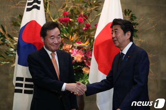 (도쿄=뉴스1) 유승관 기자 = 이낙연 국무총리가 24일 오전 일본 도쿄(東京) 총리관저에서 아베 신조(安倍晋三) 총리와 만나 악수하고 있다. 2019.10.24/뉴스1 <저작권자 © 뉴스1코리아, 무단전재 및 재배포 금지> |