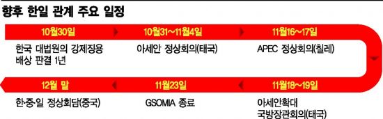 요미우리신문은 이날 아베 신조 일본 총리가 정상회담의 필요성을 담은 문 대통령의 친서를 받고도 11월 중 열리는 동남아시아국가연합(아세안)+3(한ㆍ중ㆍ일) 정상회의와 아시아태평양경제협력체(APEC) 정상회의에서 한일 정상회담을 하지 않기로 결정했다고 보도했다. 오히려 모테기 도시미쓰 외무상은 전날 "현금화 조치가 이뤄질 경우 더욱 심각한 상황이 될 것"이라고 압박에 나섰다. 우리 정부 당국자가 "한국은 한일 정상회담에 언제든 열려 있다"고 언급했지만 여전히 일본의 골대는 움직이지 않고 있는 셈이다.