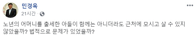 자유한국당 민경욱 의원이 문재인 대통령을 향한 ‘막말’로 비난받고 있다. 민 의원은 문 대통령 모친인 강한옥 여사 발인을 하루 앞둔 지난 30일 밤 페이스북에 “노년의 어머니를 출세한 아들이 함께는 아니더라도 근체에 모시고 살 수 있지 않았을까? 법적으로 문제가 있었을까?”라고 적었다. 누가 대상인지는 명시하지 않았지만, 문 대통령을 겨냥한 비난으로 읽혔다. 같은날 오전 문 대통령은 페이스북에 “마지막 이별의 시간이 다가오고 있다는 사실을 알면서도 자주 찾아 뵙지 못했다. 이제 당신이 믿으신 대로 하늘나라에서 아버지를 만나 영원한 안식과 행복을 누리시길 기도할 뿐”이라며 애도의 글을 올리기도 했다.