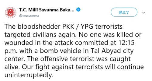 터키 국방부는 5일(현지시간) 트위터를 통해 "PKK(쿠르드노동자당)/YPG(쿠르드 민병대) 테러리스트가 또다시 민간인을 겨냥했다"며 탈 아브야드에서 테러 공격이 있었다고 밝혔다.