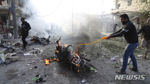 【탈 아비아드(시리아)=AP/뉴시스】터키 북동부 탈 아비아드 마을에서 2일 한 남성이 자동차 폭탄이 터진 사고 현장에서 불을 끄고 있다. 이 폭발로 13명이 숨졌다. 탈 아비아드는 쿠르드 무장세력이 통제하고 있었지만 지난달 터키의 지원을 받는 시리아 반군이 쿠르드족으로부터 통제권을 빼앗았다. 2019.11.3 |